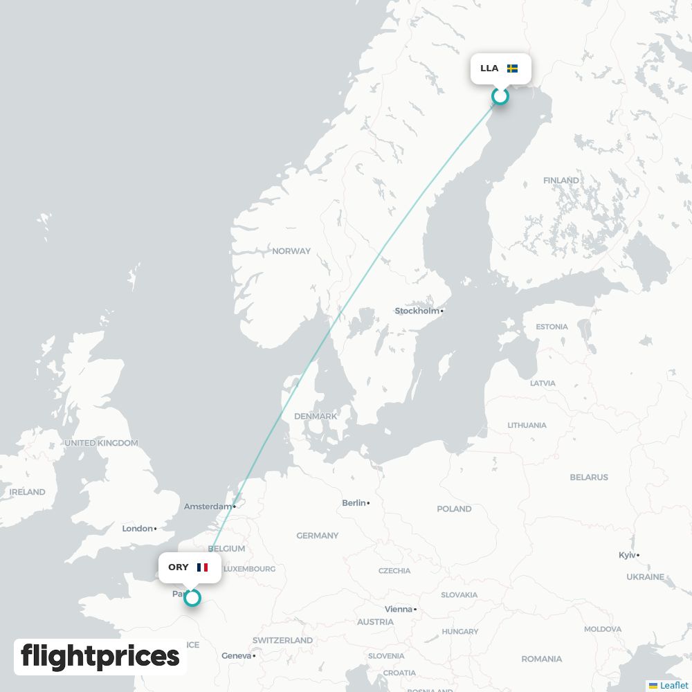 Snabb överblick av priserna på Luleå (LLA) till Paris (ORY) — lägsta och typiska priser plus billigaste månader och veckodagar att flyga samt flygbolag på sträckan och normal restid från Sverige till Frankrike.