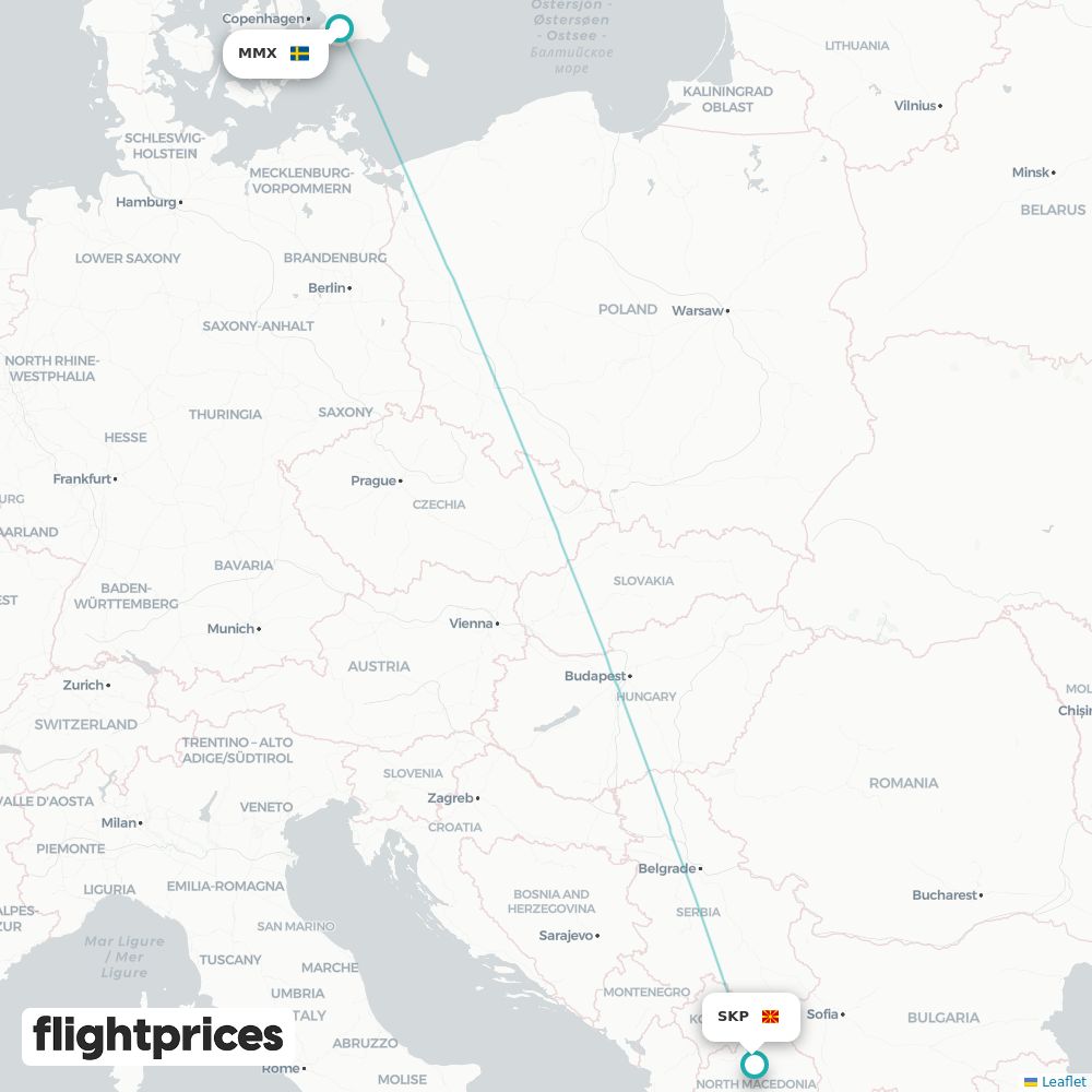 Snabb överblick av priserna på Malmö (MMX) till Skopje (SKP) — lägsta och typiska priser plus billigaste månader och veckodagar att flyga samt flygbolag på sträckan och normal restid från Sverige till Nordmakedonien.